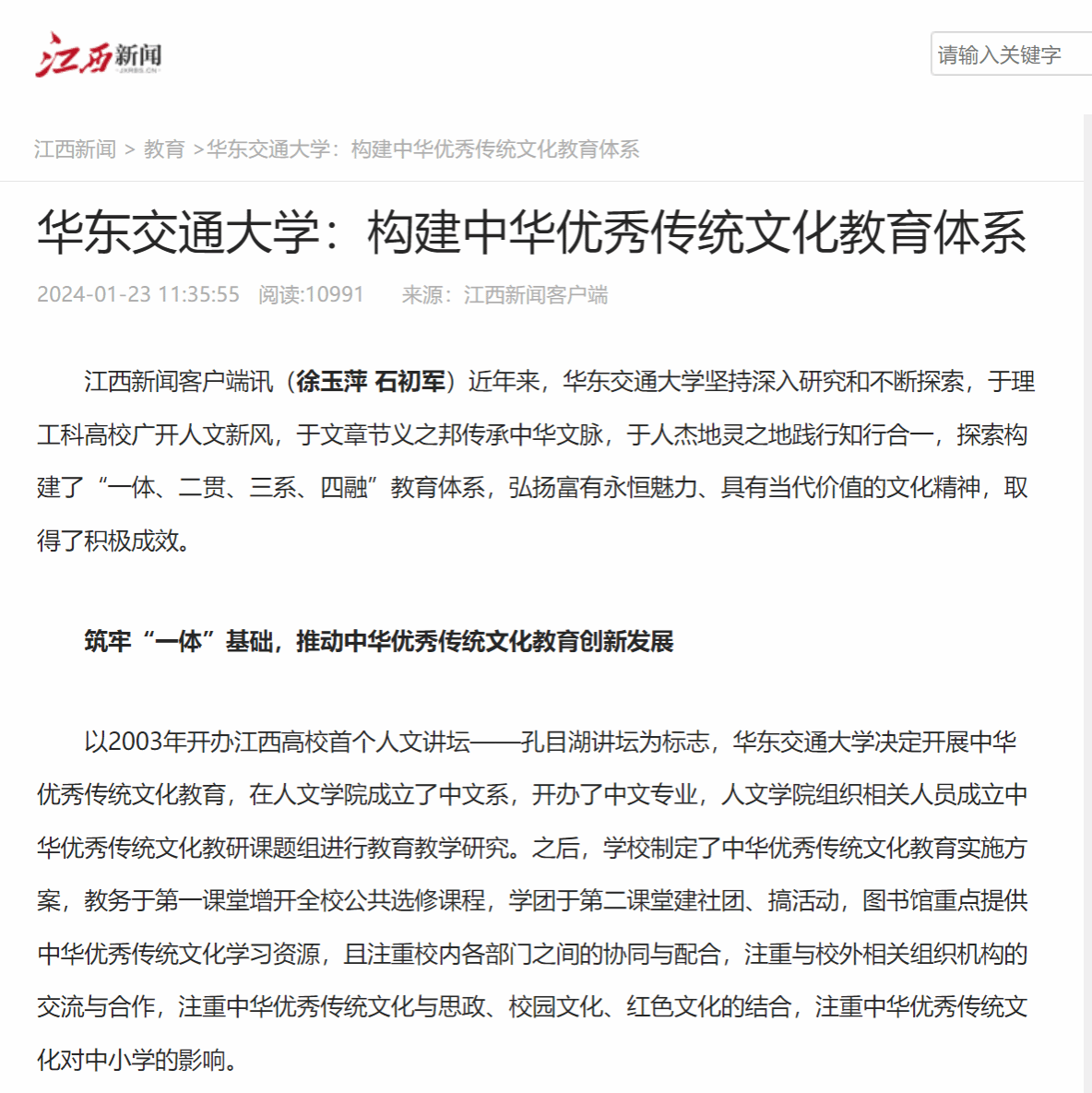 此外,学校还通过引育并举的方式建成了一支30余人的高水平专兼职中华优秀传统文化师资队伍,开发了一批交叉融合专题,例如,《从百年党史谈“两个维护”》在学习强国平台展播,“儒家文化与学生心理健康”被列入江西省10万名中小学教师心理健康教育辅导能力培训必修课程,《部编教材下的中学经典诵读实施策略》登上“千课万人”“现代与经典”等全国中小学教师培训高级平台。