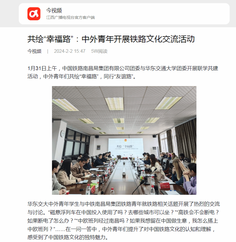 华东交大中外青年学生与中铁南昌局集团铁路青年就铁路相关话题开展了热烈的交流与讨论。“磁悬浮列车在中国投入使用了吗?去哪些城市可以坐?”“高铁会不会断电?如果断电了怎么办?”“中欧班列经过南昌吗?如果我想留在中国做生意,我怎么搭上中欧班列?”……在一问一答中,中外青年们提升了对中国铁路文化的认知和理解,感受到了中国铁路文化的独特魅力。