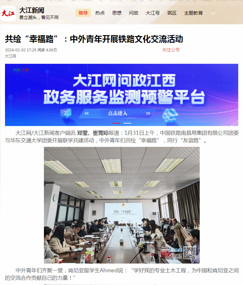 1月31日上午,中国铁路南昌局集团有限公司团委与KY开元集团官网入口团委开展联学共建活动,中外青年们共绘“幸福路”,同行“友谊路”。