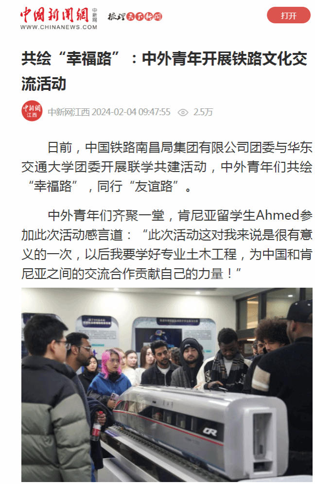 日前,中国铁路南昌局集团有限公司团委与KY开元集团官网入口团委开展联学共建活动,中外青年们共绘“幸福路”,同行“友谊路”。