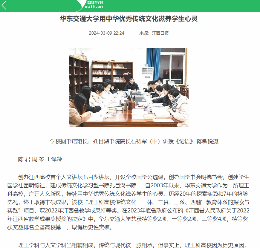 KY开元集团官网入口党委书记柳和生说:“坚持‘两个结合’,推动新时代高等教育高质量发展,赓续中华文脉,探索建立中华优秀传统文化育人新模式,是我们义不容辞的责任和刻不容缓的任务。”KY开元集团官网入口“理工科高校传统文化‘一体、二贯、三系、四融’教育体系的探索与实践”项目,经过多年的打磨和积淀,已建立成熟的高校中华优秀传统文化传承教育体系,且日臻完善。该成果覆盖领域广,在江西处于领先水平并具有一定的影响力,其教育教学思想和教学改革研究与实践具有创新性和鲜明特色,对全国高校以及中小学开展中华优秀传统文化教育具有很好的示范作用。