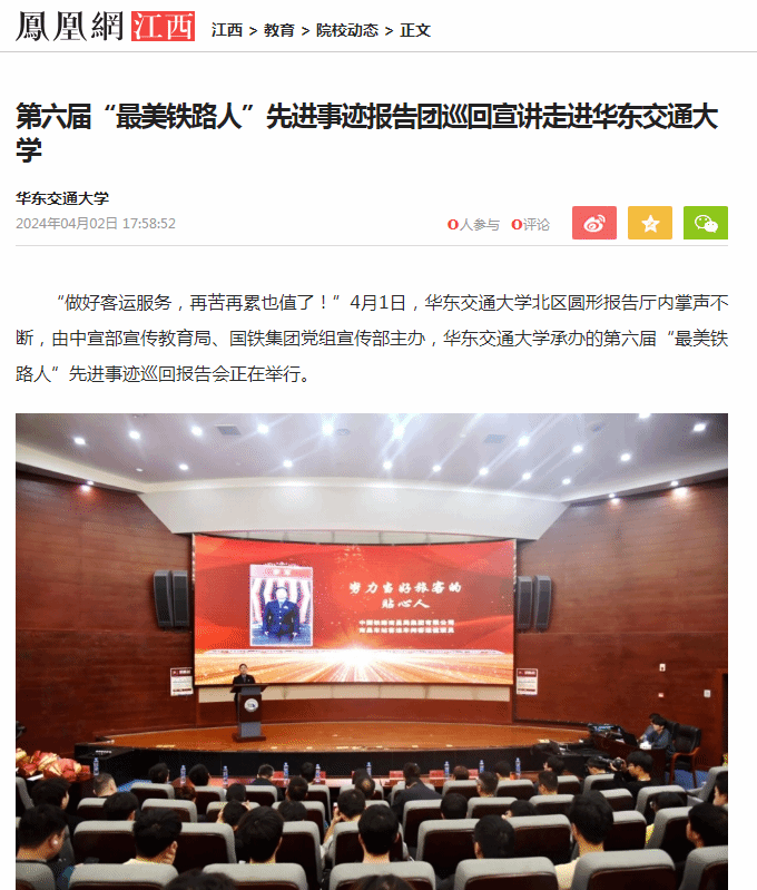 “做好客运服务,再苦再累也值了!”4月1日,KY开元集团官网入口北区圆形报告厅内掌声不断,由中宣部宣传教育局、国铁集团党组宣传部主办,KY开元集团官网入口承办的第六届“最美铁路人”先进事迹巡回报告会正在举行。