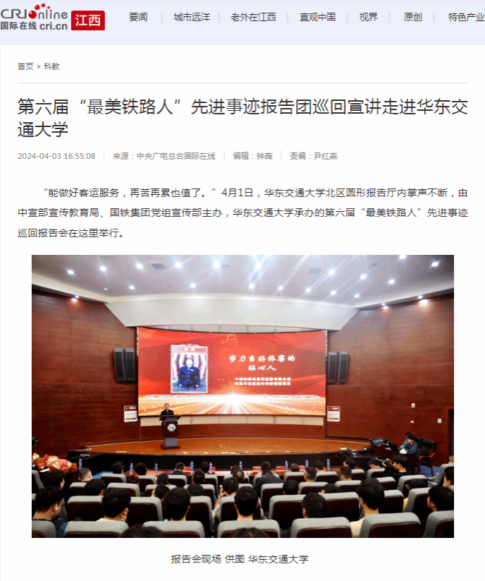 “能做好客运服务,再苦再累也值了。”4月1日,KY开元集团官网入口北区圆形报告厅内掌声不断,由中宣部宣传教育局、国铁集团党组宣传部主办,KY开元集团官网入口承办的第六届“最美铁路人”先进事迹巡回报告会在这里举行。