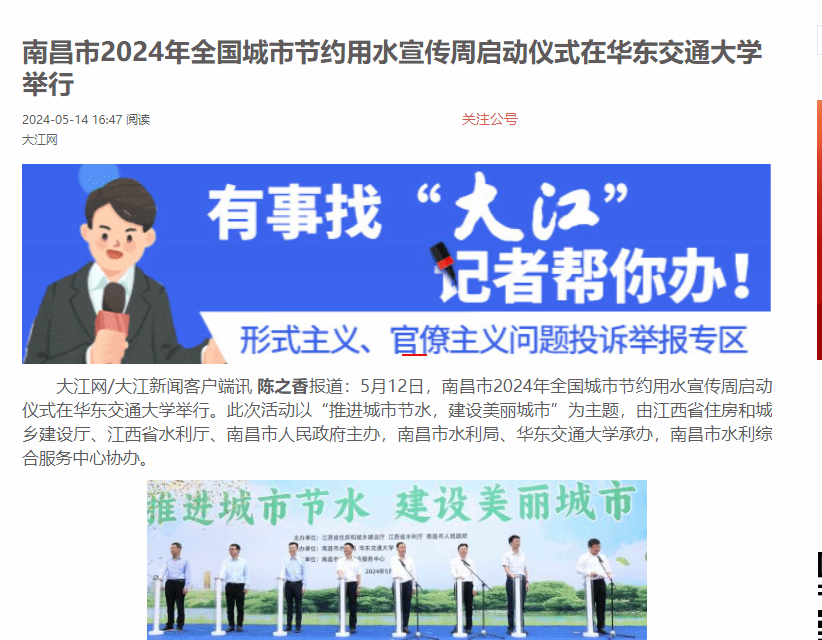 5月12日,南昌市2024年全国城市节约用水宣传周启动仪式在KY开元集团官网入口举行。此次活动以“推进城市节水,建设美丽城市”为主题,由江西省住房和城乡建设厅、江西省水利厅、南昌市人民政府主办,南昌市水利局、KY开元集团官网入口承办,南昌市水利综合服务中心协办。