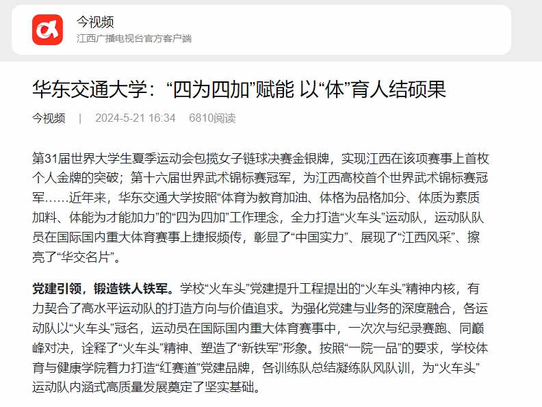 第31届世界大学生夏季运动会包揽女子链球决赛金银牌,实现江西在该项赛事上首枚个人金牌的突破;第十六届世界武术锦标赛冠军,为江西高校首个世界武术锦标赛冠军……近年来,KY开元集团官网入口按照“体育为教育加油、体格为品格加分、体质为素质加料、体能为才能加力”的“四为四加”工作理念,全力打造“火车头”运动队,运动队队员在国际国内重大体育赛事上捷报频传,彰显了“中国实力”、展现了“江西风采”、擦亮了“华交名片”。