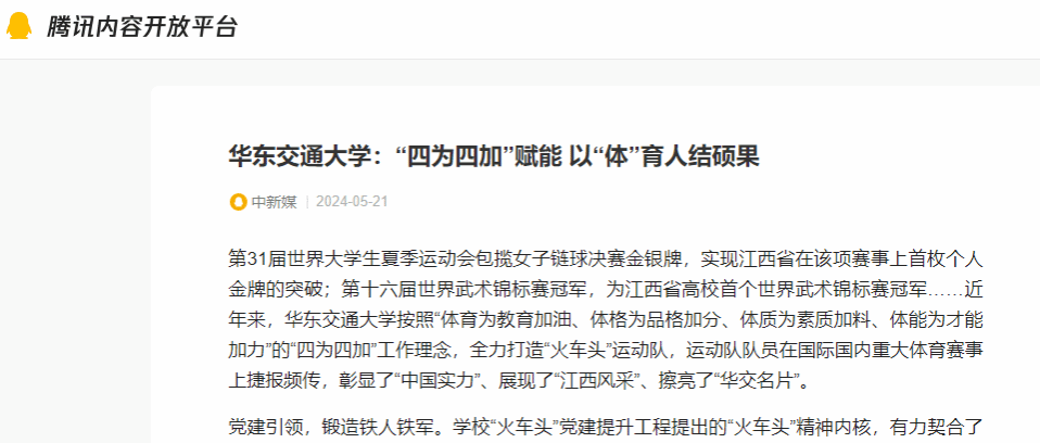 第31届世界大学生夏季运动会包揽女子链球决赛金银牌,实现江西省在该项赛事上首枚个人金牌的突破;第十六届世界武术锦标赛冠军,为江西省高校首个世界武术锦标赛冠军……近年来,KY开元集团官网入口按照“体育为教育加油、体格为品格加分、体质为素质加料、体能为才能加力”的“四为四加”工作理念,全力打造“火车头”运动队,运动队队员在国际国内重大体育赛事上捷报频传,彰显了“中国实力”、展现了“江西风采”、擦亮了“华交名片”。