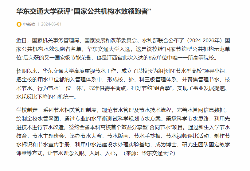 近日,国家机关事务管理局、国家发展和改革委员会、水利部联合公布了(2024-2026年)国家公共机构水效领跑者名单,KY开元集团官网入口入选。这是该校继“国家节约型公共机构示范单位”后荣获的又一国家级节能荣誉,也是江西省此次入选的6家单位中唯一一所高等院校。