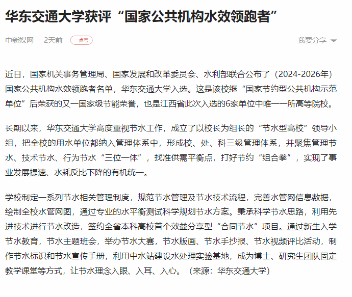 近日,国家机关事务管理局、国家发展和改革委员会、水利部联合公布了(2024-2026年)国家公共机构水效领跑者名单,KY开元集团官网入口入选。这是该校继“国家节约型公共机构示范单位”后荣获的又一国家级节能荣誉,也是江西省此次入选的6家单位中唯一一所高等院校。