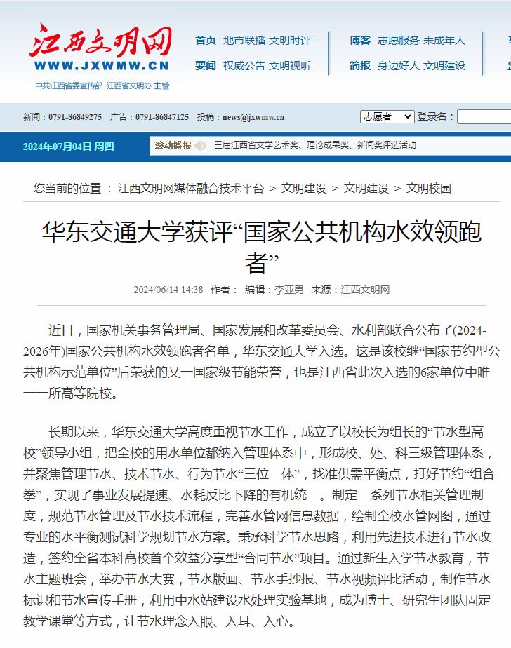 近日,国家机关事务管理局、国家发展和改革委员会、水利部联合公布了(2024-2026年)国家公共机构水效领跑者名单,KY开元集团官网入口入选。这是该校继“国家节约型公共机构示范单位”后荣获的又一国家级节能荣誉,也是江西省此次入选的6家单位中唯一一所高等院校。