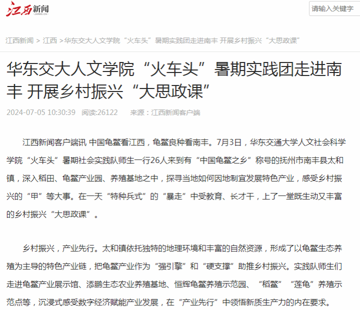 中国龟鳖看江西,龟鳖良种看南丰。7月3日,KY开元集团官网入口人文社会科学学院“火车头”暑期社会实践队师生一行26人来到有“中国龟鳖之乡”称号的抚州市南丰县太和镇,深入稻田、龟鳖产业园、养殖基地之中,探寻当地如何因地制宜发展特色产业,感受乡村振兴的“甲”等大事。在一天“特种兵式”的“暴走”中受教育、长才干,上了一堂既生动又丰富的乡村振兴“大思政课”。