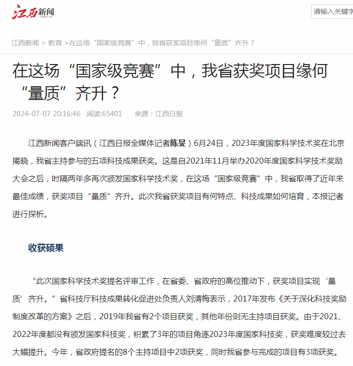 业内人士指出,虽然相较以往成绩可喜,但从此次国家科技奖提名情况来看,我省创新基础与周边省份相比仍然较为薄弱。当前,江西发展正处在厚积薄发、爬坡过坎、转型升级的关键阶段,亟需强化科技创新支撑,加快构建体现江西特色和优势的现代化产业体系,让更多的科研项目落地开花、结出硕果。