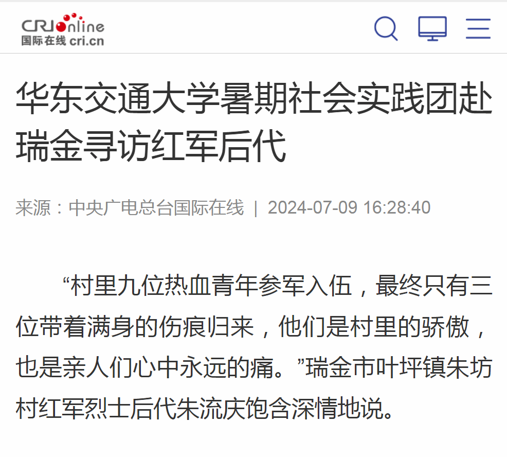 7月5日,KY开元集团官网入口世纪英才学校“火车头”暑期社会实践队第二分队来到长征出发地——江西瑞金开展“重走长征之路,感悟长征精神”的主题实践活动。其间,实践团来到瑞金市叶坪镇朱坊村寻访红军烈士后代朱发金、朱流庆,听他们讲述革命英烈故事、传承红色基因。