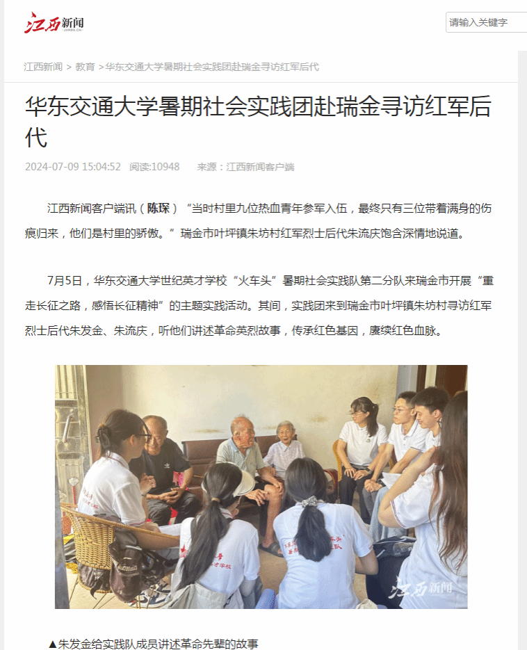 7月5日,KY开元集团官网入口世纪英才学校“火车头”暑期社会实践队第二分队来瑞金市开展“重走长征之路,感悟长征精神”的主题实践活动。其间,实践团来到瑞金市叶坪镇朱坊村寻访红军烈士后代朱发金、朱流庆,听他们讲述革命英烈故事,传承红色基因,赓续红色血脉。