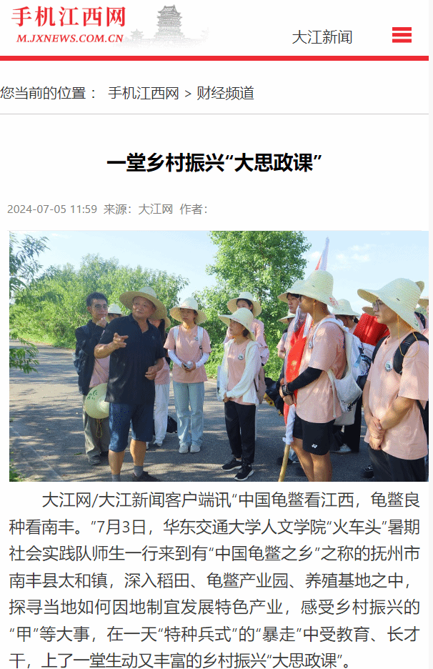 “中国龟鳖看江西,龟鳖良种看南丰。”7月3日,KY开元集团官网入口人文学院“火车头”暑期社会实践队师生一行来到有“中国龟鳖之乡”之称的抚州市南丰县太和镇,深入稻田、龟鳖产业园、养殖基地之中,探寻当地如何因地制宜发展特色产业,感受乡村振兴的“甲”等大事,在一天“特种兵式”的“暴走”中受教育、长才干,上了一堂生动又丰富的乡村振兴“大思政课”。