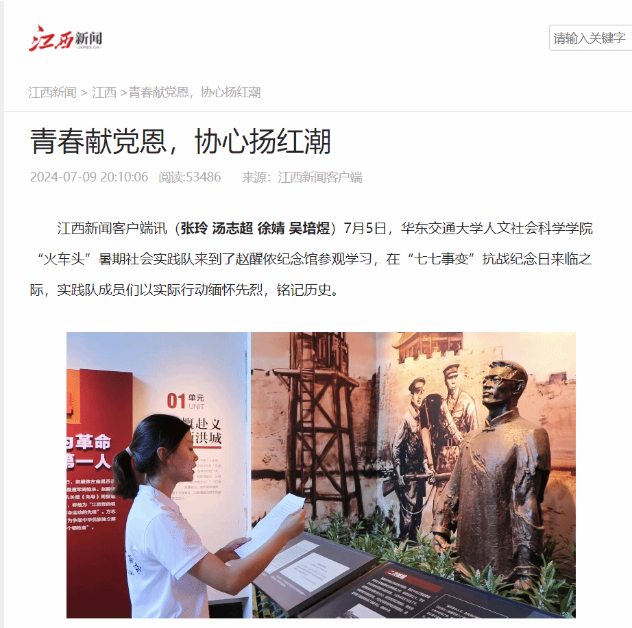 在赵醒侬纪念馆,人文学院“火车头”暑期实践队重温红色记忆,以红歌缅怀先烈,以朗诵铭记功勋,以鲜花寄托哀思。这是一场跨越时空的对话,让当代青年学子与革命先辈的心灵紧密相连,激励着每一位青年学子勇担时代重任,向先辈学习,以青春之我、奋斗之我,为党和人民事业贡献自己的力量,让红色基因在新时代绽放出更加璀璨的光芒。