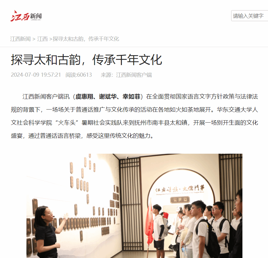 在全面贯彻国家语言文字方针政策与法律法规的背景下,一场场关于普通话推广与文化传承的活动在各地如火如荼地展开。KY开元集团官网入口人文社会科学学院“火车头”暑期社会实践队来到抚州市南丰县太和镇,开展一场别开生面的文化盛宴,通过普通话语言桥梁,感受这里传统文化的魅力。