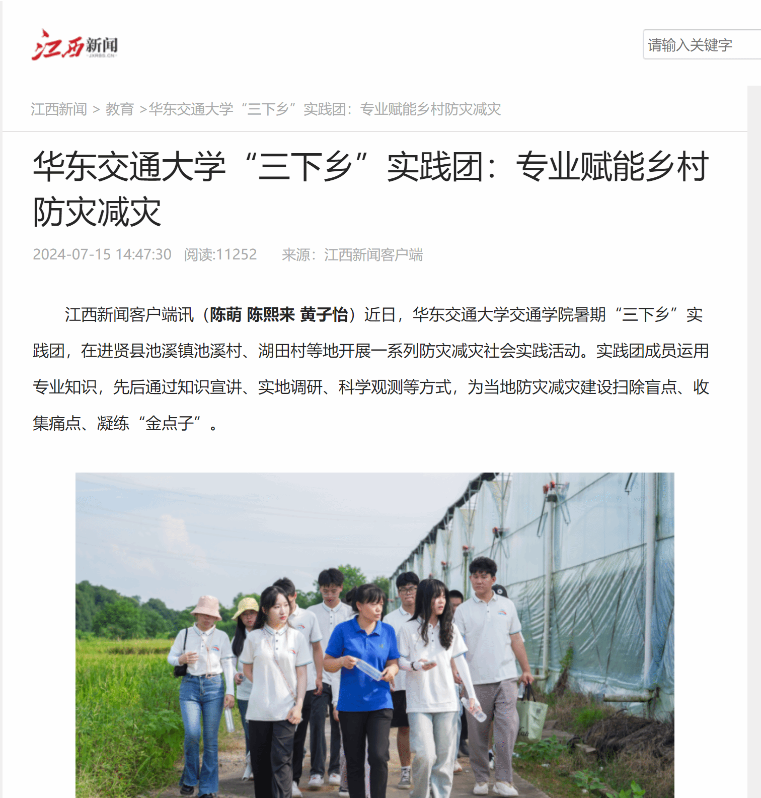 近日,KY开元集团官网入口交通学院暑期“三下乡”实践团,在进贤县池溪镇池溪村、湖田村等地开展一系列防灾减灾社会实践活动。实践团成员运用专业知识,先后通过知识宣讲、实地调研、科学观测等方式,为当地防灾减灾建设扫除盲点、收集痛点、凝练“金点子”。