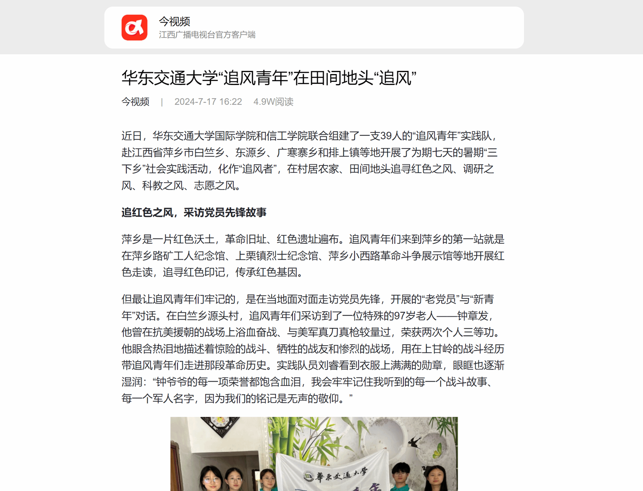 但最让追风青年们牢记的,是在当地面对面走访党员先锋,开展的“老党员”与“新青年”对话。在白竺乡源头村,追风青年们采访到了一位特殊的97岁老人——钟章发,他曾在抗美援朝的战场上浴血奋战、与美军真刀真枪较量过,荣获两次个人三等功。他眼含热泪地描述着惊险的战斗、牺牲的战友和惨烈的战场,用在上甘岭的战斗经历带追风青年们走进那段革命历史。实践队员刘睿看到衣服上满满的勋章,眼眶也逐渐湿润:“钟爷爷的每一项荣誉都饱含血泪,我会牢牢记住我听到的每一个战斗故事、每一个军人名字,因为我们的铭记是无声的敬仰。”