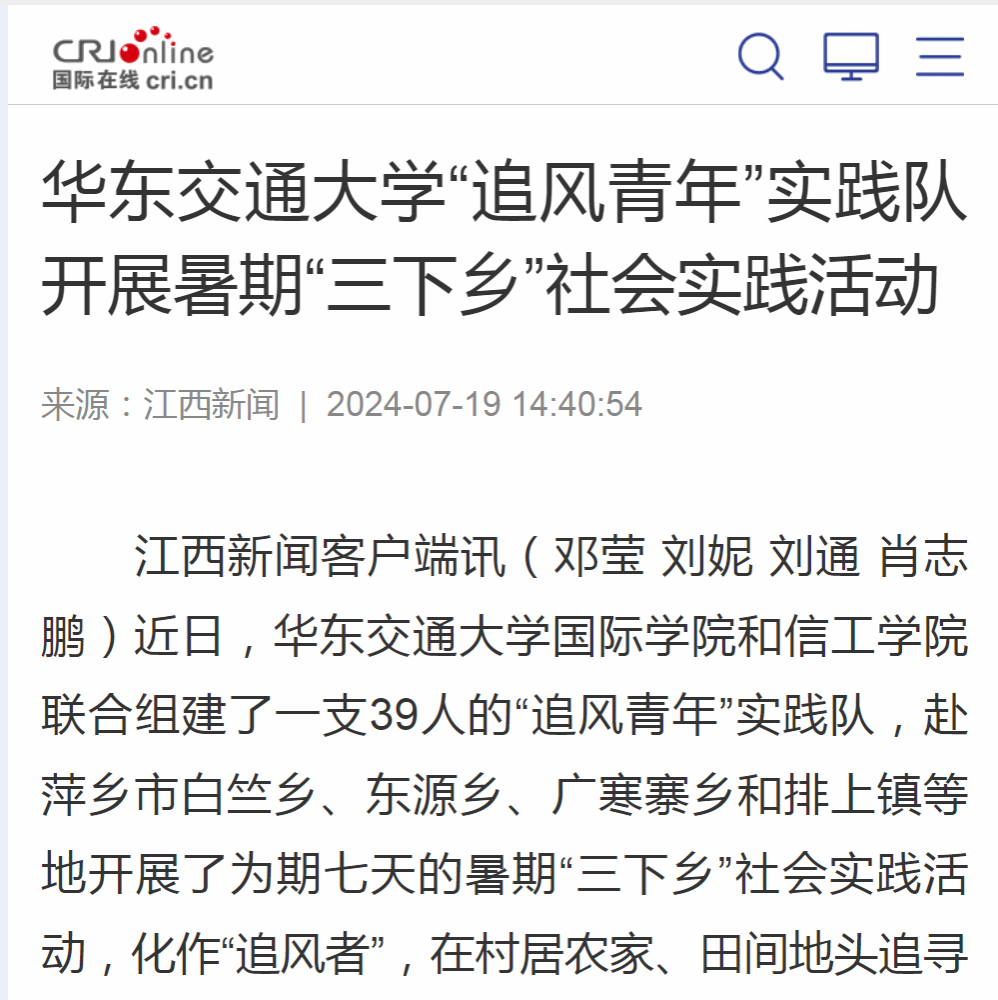 近日,KY开元集团官网入口国际学院和信工学院联合组建了一支39人的“追风青年”实践队,赴萍乡市白竺乡、东源乡、广寒寨乡和排上镇等地开展了为期七天的暑期“三下乡”社会实践活动,化作“追风者”,在村居农家、田间地头追寻红色之风、调研之风、科教之风、志愿之风。