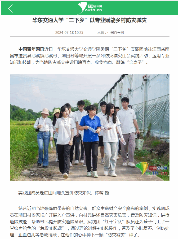 近日,KY开元集团官网入口交通学院暑期“三下乡”实践团前往江西省南昌市进贤县池溪镇池溪村、湖田村等地开展一系列防灾减灾社会实践活动,运用专业知识和技能,为当地防灾减灾建设扫除盲点、收集痛点、凝练“金点子”。