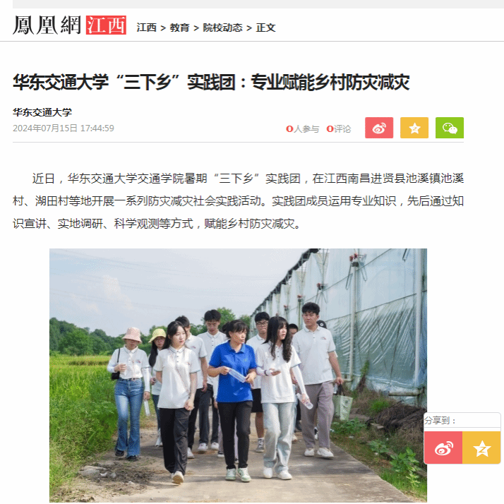 近日,KY开元集团官网入口交通学院暑期“三下乡”实践团,在江西南昌进贤县池溪镇池溪村、湖田村等地开展一系列防灾减灾社会实践活动。实践团成员运用专业知识,先后通过知识宣讲、实地调研、科学观测等方式,赋能乡村防灾减灾。
