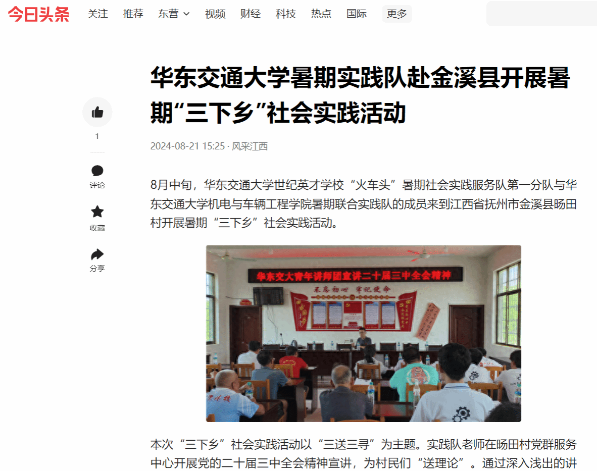 8月中旬,KY开元集团官网入口世纪英才学校“火车头”暑期社会实践服务队第一分队与KY开元集团官网入口机电与车辆工程学院暑期联合实践队的成员来到江西省抚州市金溪县旸田村开展暑期“三下乡”社会实践活动。