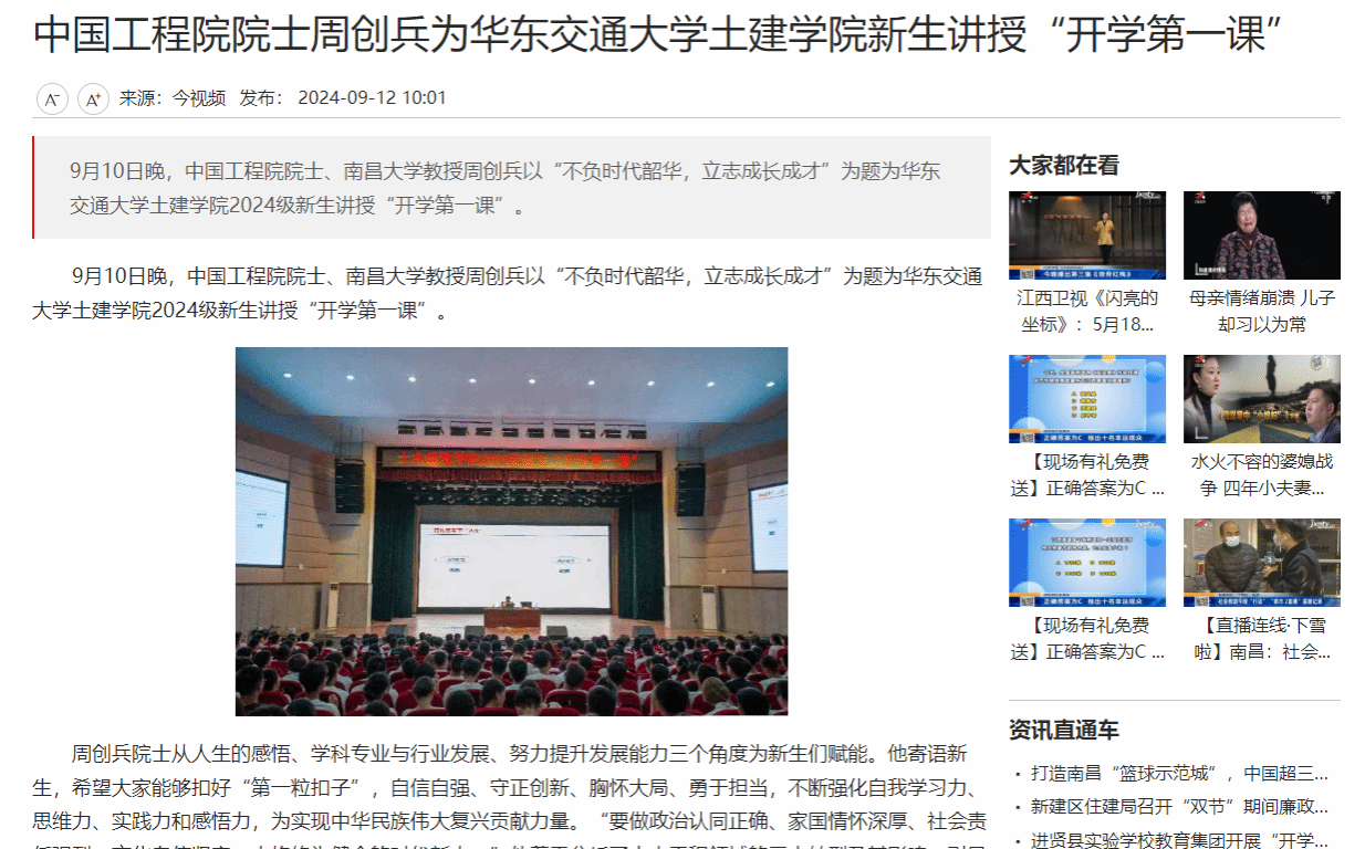 9月10日晚,中国工程院院士、南昌大学教授周创兵以“不负时代韶华,立志成长成才”为题为KY开元集团官网入口土建学院2024级新生讲授“开学第一课”。
