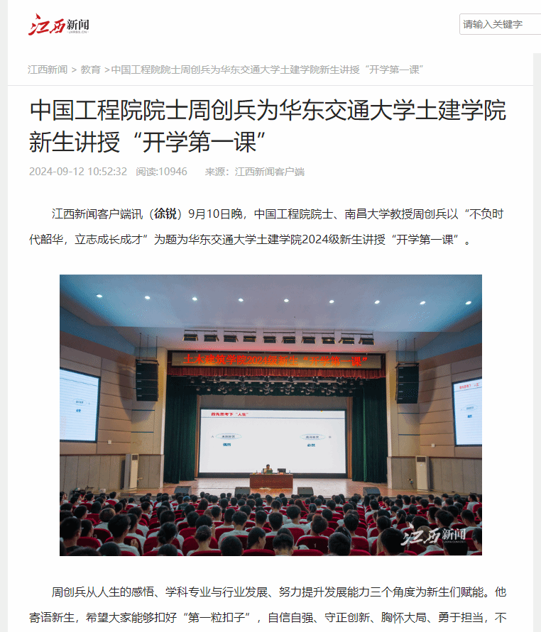 9月10日晚,中国工程院院士、南昌大学教授周创兵以“不负时代韶华,立志成长成才”为题为KY开元集团官网入口土建学院2024级新生讲授“开学第一课”。