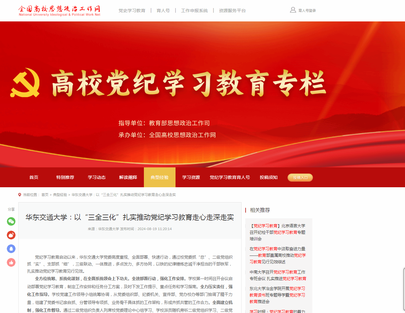 全员覆盖、精准化研学,在深化理解运用上下功夫。以上率下学。校党委书记认真履行第一责任人职责,亲自部署;校党委理论中心组专题学习7次,党委会“第一议题”学习8次,带头在学深悟透上下功夫,抓实抓好交流研讨,不断增强党纪学习教育的精准性、实效性。分层分类学。学院党委理论中心组开展“1(总则)+6(六项纪律)”专题研讨;二级党组织全过程、全覆盖指导所辖党支部制定并落实好党纪学习教育计划;党员均制定个人自学计划,支部通过多种方式监督党员学习、检验学习效果。精准定位学。各二级党组织班子成员分别到联系支部指导分类施策,讲好纪律党课。党支部采取轮流领学导读等方式,结合师德师风、意识形态、作风建设、学术诚信、校纪校规等边学习、边检视、边提高。举办党员干部读书班,开展新提拔干部、年轻干部、关键岗位干部等重点对象纪律培训,以训助学。深入实施“新铁军”干部培育计划,举办全校年轻干部座谈会,进一步抓好年轻干部的纪律教育,激发干事创业新动力。形式多样学。学校官网、官微开设“党纪学习教育”专栏和板块,校纪委“廉洁华交”、组织部“华交组工”等微信公众号设立《条例》学习专区,以多种形式解读《条例》;通过网站、公众号、宣传橱窗、文化长廊建设,线上线下打造廉洁教育宣传矩阵;开展“话廉润心”“视廉清心”“画廉正心”征集及同上一堂廉洁文化课、微网课、实践课等廉洁教育系列活动;交通学院、信工学院等学院党委分别为毕业生党员讲好纪律专题党课,离退处党委以“自学+集中学+送学”为主要学习形式,坚持为老党员“送学上门”、为外地党员寄送学习资料、为流动党员定人定点推送学习资料等,提升党纪学习教育实效。各二级党组织组织党员前往方志敏烈士纪念园、八一起义展示馆、省博物馆红色历史展厅、省红色图书馆、南昌新四军军部旧址陈列馆等地开展主题党日活动。各分党校将《条例》学习纳入入党积极分子培训班、预备党员培训班的重要内容,并把党纪学习教育和国法校规校纪、学生手册教育结合起来,做到活学活用、学用结合。机关党委班子成员分别到联系支部讲纪律党课,党支部之间列席旁听实现全覆盖。