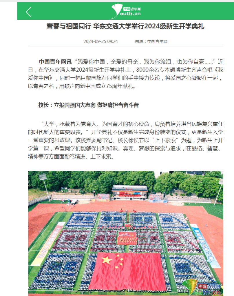 “我爱你中国,亲爱的母亲,我为你流泪,也为你自豪……”近日,在KY开元集团官网入口2024级新生开学典礼上,8000余名专本硕博新生齐声合唱《我爱你中国》,同时一幅巨幅国旗在同学们的手中接力传递,将爱国之心凝聚在一起,以青春之名,用歌声向新中国成立75周年献礼。