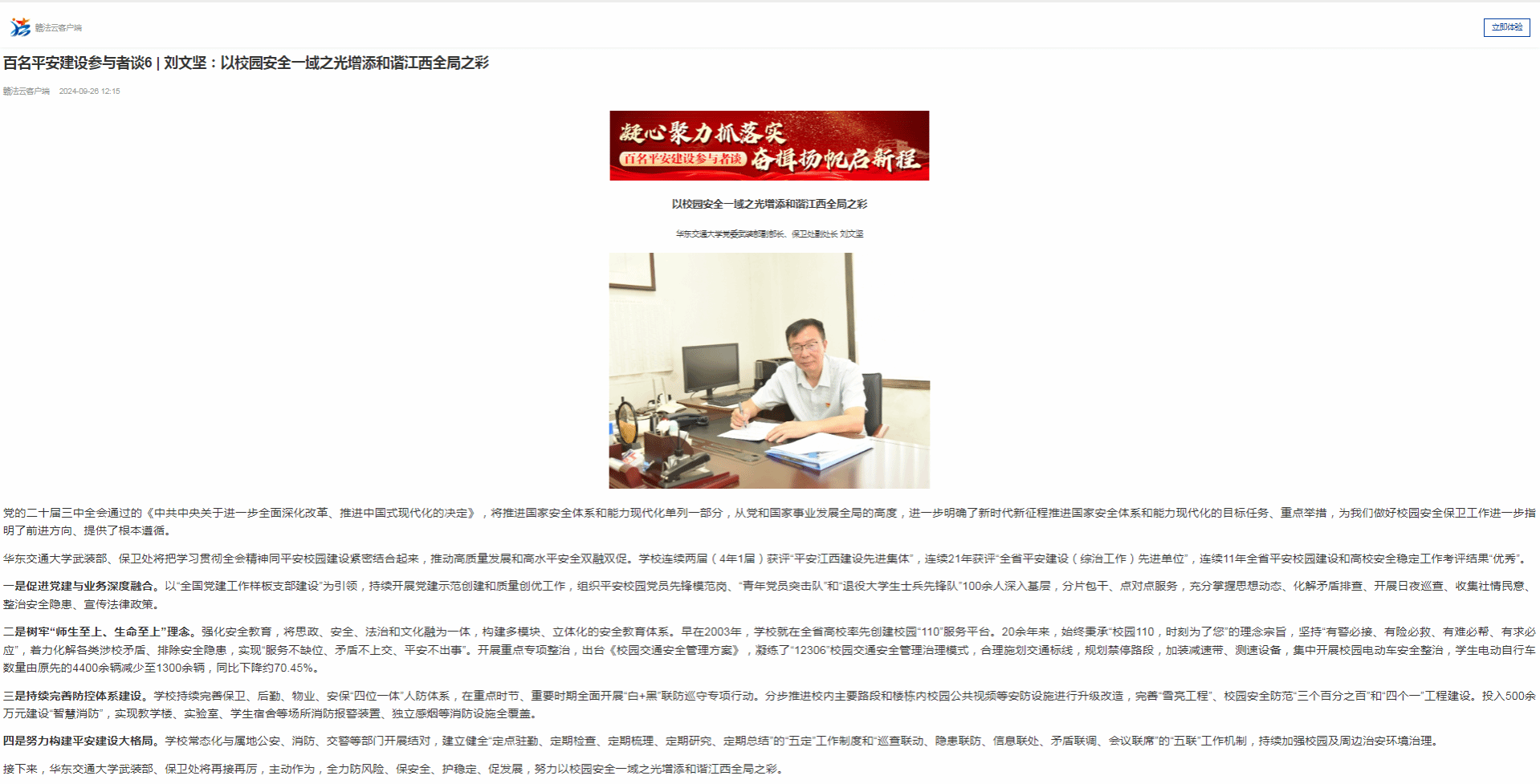 二是树牢“师生至上、生命至上”理念。强化安全教育,将思政、安全、法治和文化融为一体,构建多模块、立体化的安全教育体系。早在2003年,学校就在全省高校率先创建校园“110”服务平台。20余年来,始终秉承“校园110,时刻为了您”的理念宗旨,坚持“有警必接、有险必救、有难必帮、有求必应”,着力化解各类涉校矛盾、排除安全隐患,实现“服务不缺位、矛盾不上交、平安不出事”。开展重点专项整治,出台《校园交通安全管理方案》,凝练了“12306”校园交通安全管理治理模式,合理施划交通标线,规划禁停路段,加装减速带、测速设备,集中开展校园电动车安全整治,学生电动自行车数量由原先的4400余辆减少至1300余辆,同比下降约70.45%。