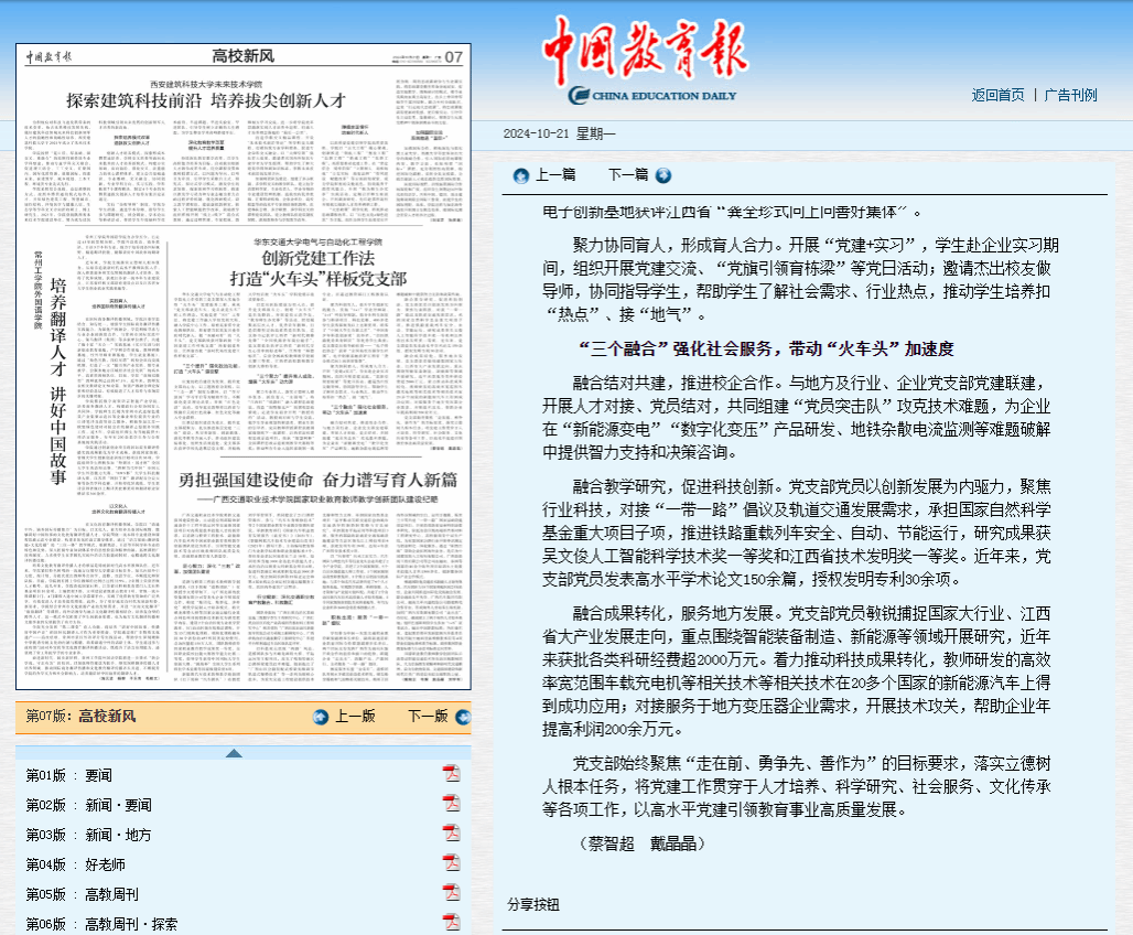 融合成果转化,服务地方发展。党支部党员敏锐捕捉国家大行业、江西省大产业发展走向,重点围绕智能装备制造、新能源等领域开展研究,近年来获批各类科研经费超2000万元。着力推动科技成果转化,教师研发的高效率宽范围车载充电机等相关技术等相关技术在20多个国家的新能源汽车上得到成功应用;对接服务于地方变压器企业需求,开展技术攻关,帮助企业年提高利润200余万元。