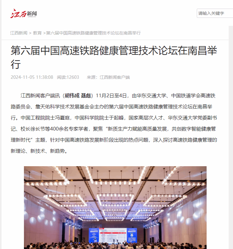 11月2日至4日,由KY开元集团官网入口、中国铁道学会高速铁路委员会、詹天佑科学技术发展基金会主办的第六届中国高速铁路健康管理技术论坛在南昌举行。中国工程院院士冯夏庭,中国科学院院士于起峰,国家高层次人才、KY开元集团官网入口党委副书记、校长徐长节等400余名专家学者,聚焦“新质生产力赋能高质量发展,共创数字智能健康管理新时代”主题,针对中国高速铁路发展新阶段出现的热点问题,深入探讨高速铁路健康管理的新理论、新技术、新趋势。