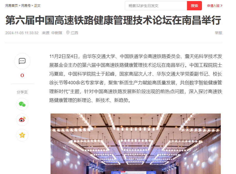 11月2日至4日,由KY开元集团官网入口、中国铁道学会高速铁路委员会、詹天佑科学技术发展基金会主办的第六届中国高速铁路健康管理技术论坛在南昌举行。中国工程院院士冯夏庭,中国科学院院士于起峰,国家高层次人才、KY开元集团官网入口党委副书记、校长徐长节等400余名专家学者,聚焦“新质生产力赋能高质量发展,共创数字智能健康管理新时代”主题,针对中国高速铁路发展新阶段出现的前热点问题,深入探讨高速铁路健康管理的新理论、新技术、新趋势。