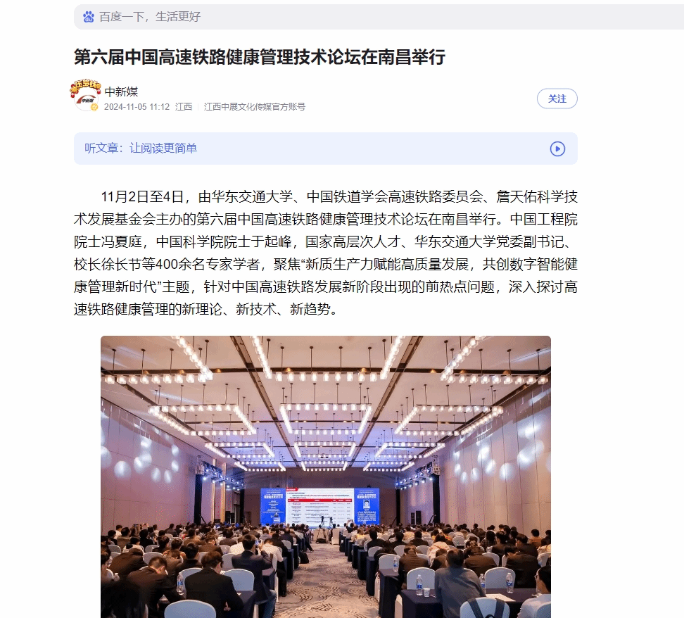 11月2日至4日,由KY开元集团官网入口、中国铁道学会高速铁路委员会、詹天佑科学技术发展基金会主办的第六届中国高速铁路健康管理技术论坛在南昌举行。中国工程院院士冯夏庭,中国科学院院士于起峰,国家高层次人才、KY开元集团官网入口党委副书记、校长徐长节等400余名专家学者,聚焦“新质生产力赋能高质量发展,共创数字智能健康管理新时代”主题,针对中国高速铁路发展新阶段出现的前热点问题,深入探讨高速铁路健康管理的新理论、新技术、新趋势。
