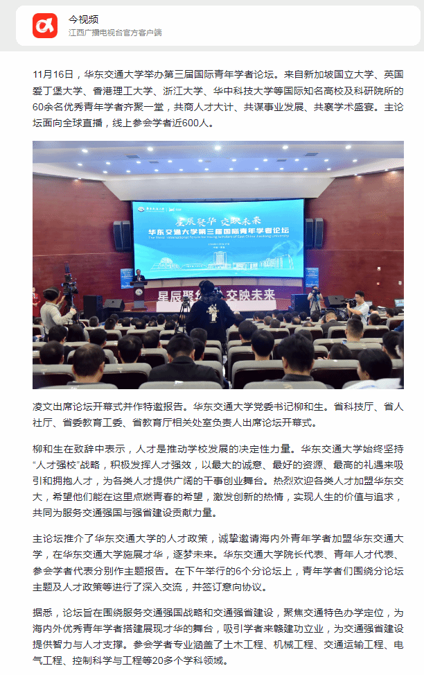 据悉,论坛旨在围绕服务交通强国战略和交通强省建设,聚焦交通特色办学定位,为海内外优秀青年学者搭建展现才华的舞台,吸引学者来赣建功立业,为交通强省建设提供智力与人才支撑。参会学者专业涵盖了土木工程、机械工程、交通运输工程、电气工程、控制科学与工程等20多个学科领域。
