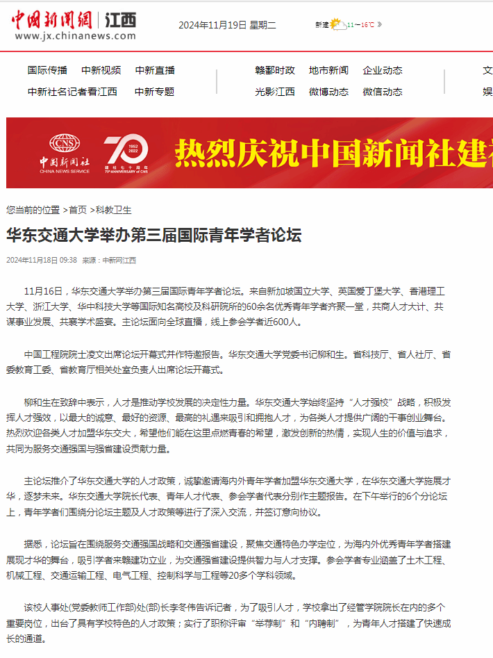 据悉,论坛旨在围绕服务交通强国战略和交通强省建设,聚焦交通特色办学定位,为海内外优秀青年学者搭建展现才华的舞台,吸引学者来赣建功立业,为交通强省建设提供智力与人才支撑。参会学者专业涵盖了土木工程、机械工程、交通运输工程、电气工程、控制科学与工程等20多个学科领域。