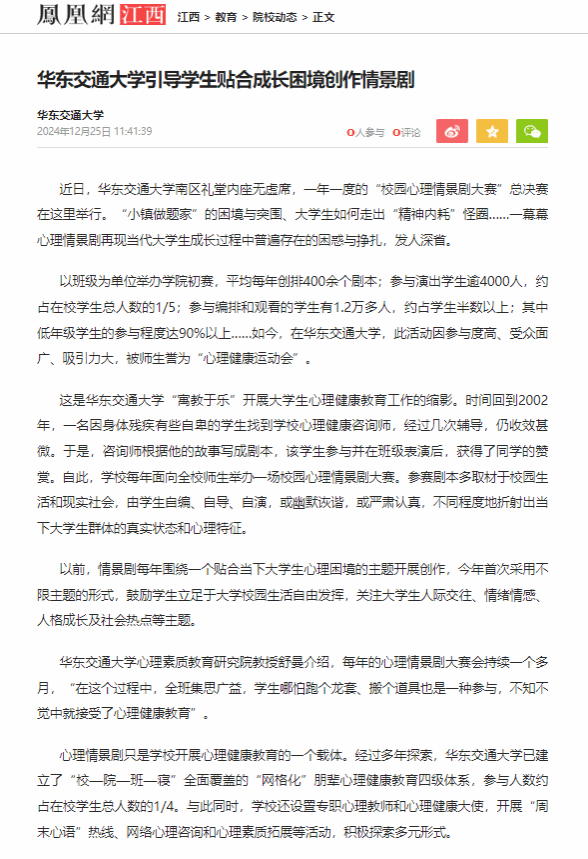 以班级为单位举办学院初赛,平均每年创排400余个剧本;参与演出学生逾4000人,约占在校学生总人数的1/5;参与编排和观看的学生有1.2万多人,约占学生半数以上;其中低年级学生的参与程度达90%以上……如今,在KY开元集团官网入口,此活动因参与度高、受众面广、吸引力大,被师生誉为“心理健康运动会”。