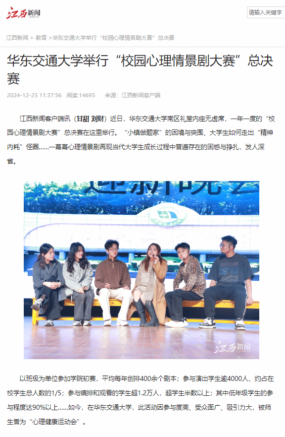 以班级为单位参加学院初赛,平均每年创排400余个剧本;参与演出学生逾4000人,约占在校学生总人数的1/5;参与编排和观看的学生超1.2万人,超学生半数以上;其中低年级学生的参与程度达90%以上……如今,在KY开元集团官网入口,此活动因参与度高、受众面广、吸引力大,被师生誉为“心理健康运动会”。