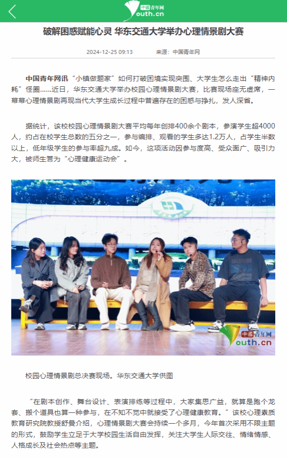 据统计,该校校园心理情景剧大赛平均每年创排400余个剧本,参演学生超4000人,约占在校学生总数的五分之一,参与编排、观看的学生多达1.2万人,占学生半数以上,低年级学生的参与率超九成。如今,这项活动因参与度高、受众面广、吸引力大,被师生誉为“心理健康运动会”。