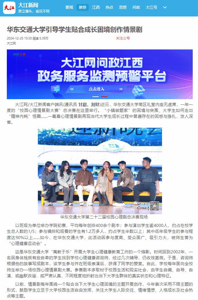 以班级为单位举办学院初赛,平均每年创排400余个剧本;参与演出学生逾4000人,约占在校学生总人数的1/5;参与编排和观看的学生有1.2万多人,约占学生半数以上;其中低年级学生的参与程度达90%以上……如今,在KY开元集团官网入口,此活动因参与度高、受众面广、吸引力大,被师生誉为“心理健康运动会”。