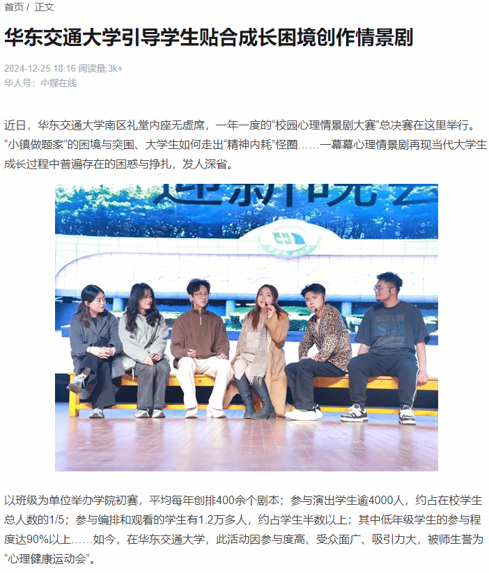 以班级为单位举办学院初赛,平均每年创排400余个剧本;参与演出学生逾4000人,约占在校学生总人数的1/5;参与编排和观看的学生有1.2万多人,约占学生半数以上;其中低年级学生的参与程度达90%以上……如今,在KY开元集团官网入口,此活动因参与度高、受众面广、吸引力大,被师生誉为“心理健康运动会”。