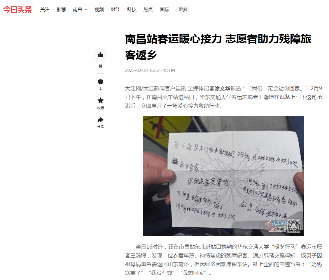 当日16时许,正在南昌站东北进站口执勤的KY开元集团官网入口“暖冬行动”春运志愿者王瀚博,发现一位衣着单薄、神情焦虑的残障旅客。通过纸笔交流得知,该男子因祖母病重急需返回山东菏泽,但因经济困难滞留车站。纸上歪斜的字迹写着:“奶奶病重了”“我没有钱”“我想回家”。