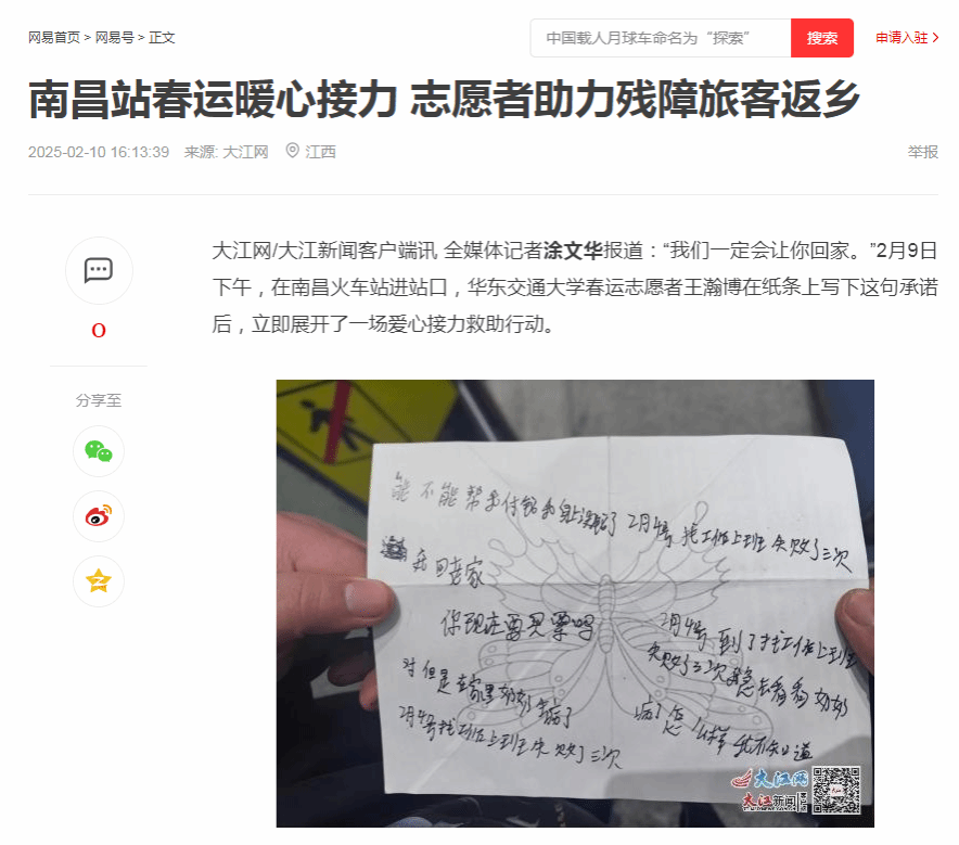 当日16时许,正在南昌站东北进站口执勤的KY开元集团官网入口“暖冬行动”春运志愿者王瀚博,发现一位衣着单薄、神情焦虑的残障旅客。通过纸笔交流得知,该男子因祖母病重急需返回山东菏泽,但因经济困难滞留车站。纸上歪斜的字迹写着:“奶奶病重了”“我没有钱”“我想回家”。