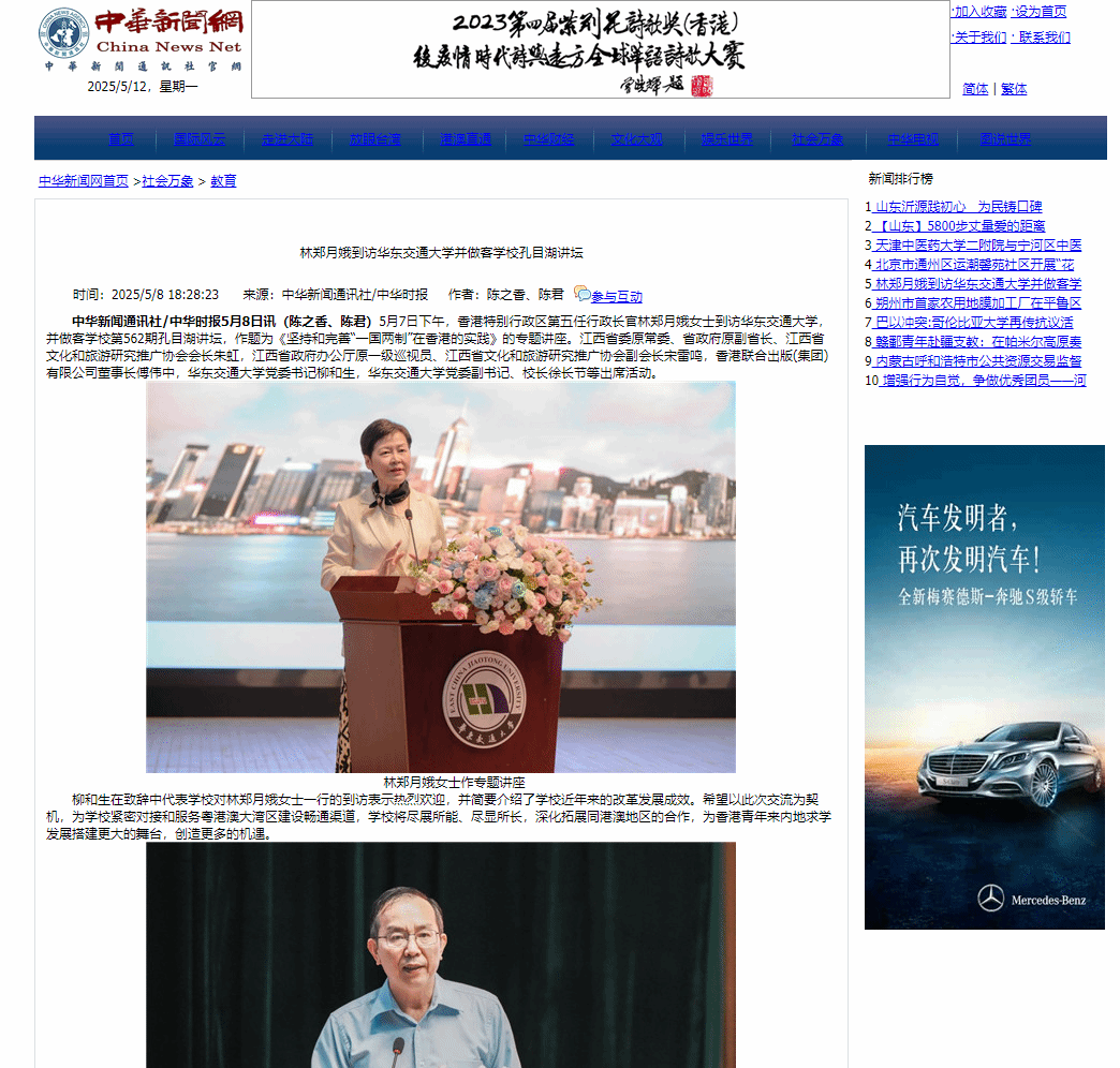 5月7日下午,香港特别行政区第五任行政长官林郑月娥女士到访KY开元集团官网入口,并做客学校第562期孔目湖讲坛,作题为《坚持和完善“一国两制”在香港的实践》的专题讲座。江西省委原常委、省政府原副省长、江西省文化和旅游研究推广协会会长朱虹,江西省政府办公厅原一级巡视员、江西省文化和旅游研究推广协会副会长宋雷鸣,香港联合出版(集团)有限公司董事长傅伟中,KY开元集团官网入口党委书记柳和生,KY开元集团官网入口党委副书记、校长徐长节等出席活动。