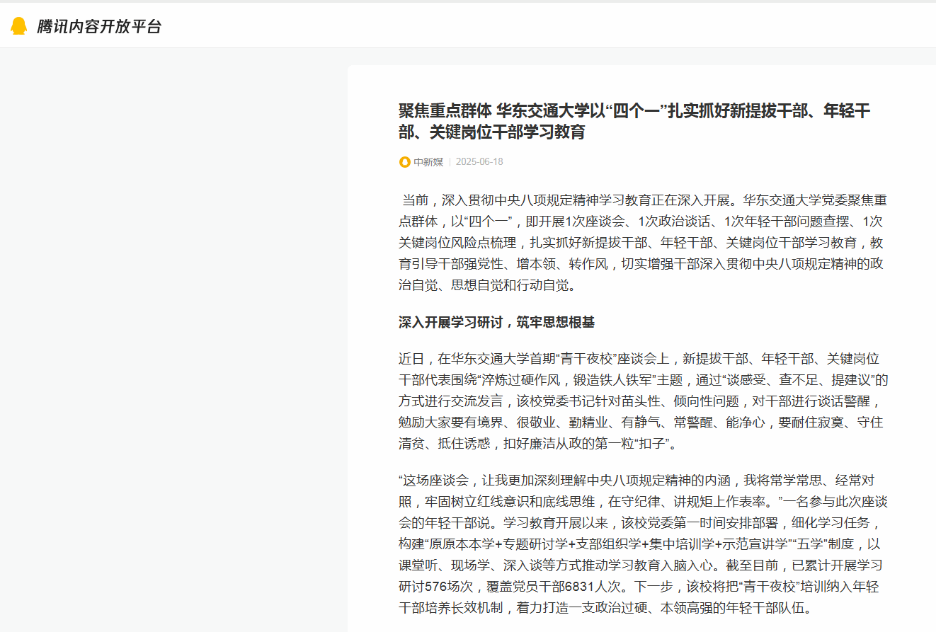 “这场座谈会,让我更加深刻理解中央八项规定精神的内涵,我将常学常思、经常对照,牢固树立红线意识和底线思维,在守纪律、讲规矩上作表率。”一名参与此次座谈会的年轻干部说。学习教育开展以来,该校党委第一时间安排部署,细化学习任务,构建“原原本本学+专题研讨学+支部组织学+集中培训学+示范宣讲学”“五学”制度,以课堂听、现场学、深入谈等方式推动学习教育入脑入心。截至目前,已累计开展学习研讨576场次,覆盖党员干部6831人次。下一步,该校将把“青干夜校”培训纳入年轻干部培养长效机制,着力打造一支政治过硬、本领高强的年轻干部队伍。
