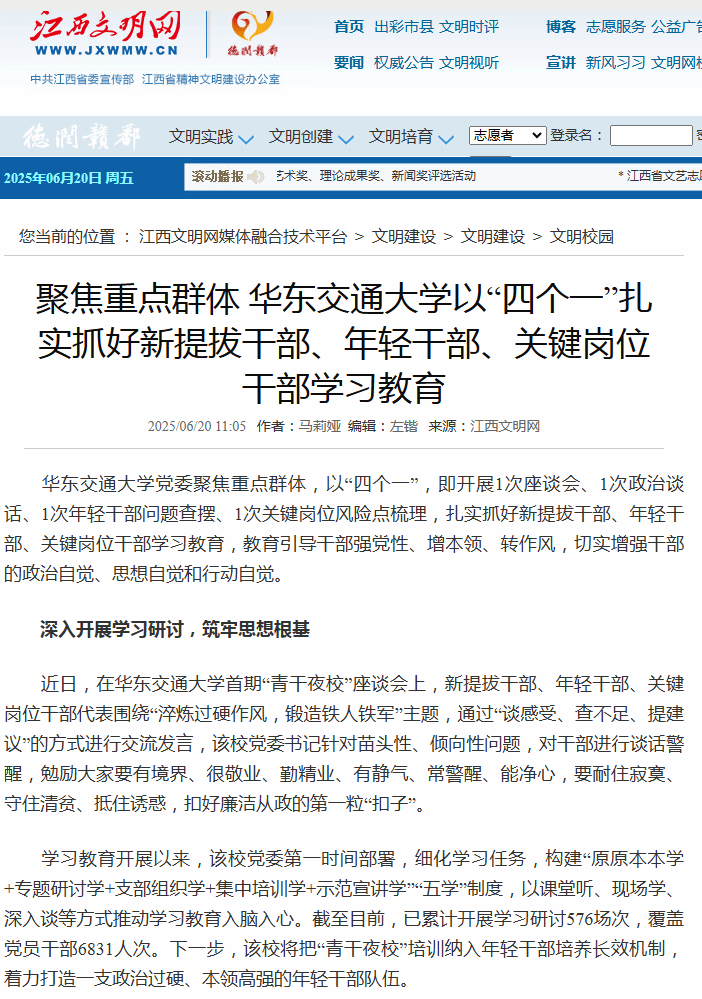 学习教育开展以来,该校党委第一时间部署,细化学习任务,构建“原原本本学+专题研讨学+支部组织学+集中培训学+示范宣讲学”“五学”制度,以课堂听、现场学、深入谈等方式推动学习教育入脑入心。截至目前,已累计开展学习研讨576场次,覆盖党员干部6831人次。下一步,该校将把“青干夜校”培训纳入年轻干部培养长效机制,着力打造一支政治过硬、本领高强的年轻干部队伍。