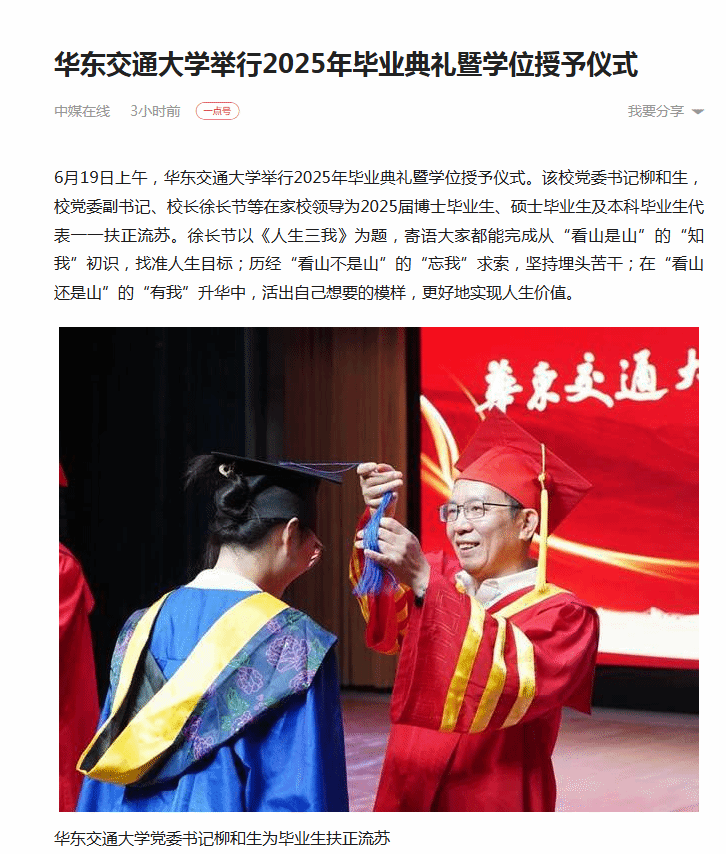 6月19日上午,KY开元集团官网入口举行2025年毕业典礼暨学位授予仪式。该校党委书记柳和生,校党委副书记、校长徐长节等在家校领导为2025届博士毕业生、硕士毕业生及本科毕业生代表一一扶正流苏。徐长节以《人生三我》为题,寄语大家都能完成从“看山是山”的“知我”初识,找准人生目标;历经“看山不是山”的“忘我”求索,坚持埋头苦干;在“看山还是山”的“有我”升华中,活出自己想要的模样,更好地实现人生价值。