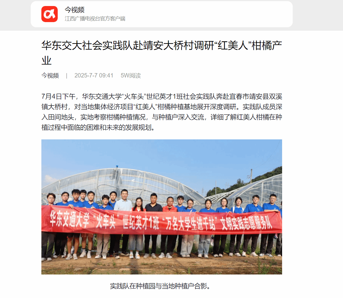 7月4日下午,KY开元集团官网入口“火车头”世纪英才1班社会实践队奔赴宜春市靖安县双溪镇大桥村,对当地集体经济项目“红美人”柑橘种植基地展开深度调研。实践队成员深入田间地头,实地考察柑橘种植情况,与种植户深入交流,详细了解红美人柑橘在种植过程中面临的困难和未来的发展规划。