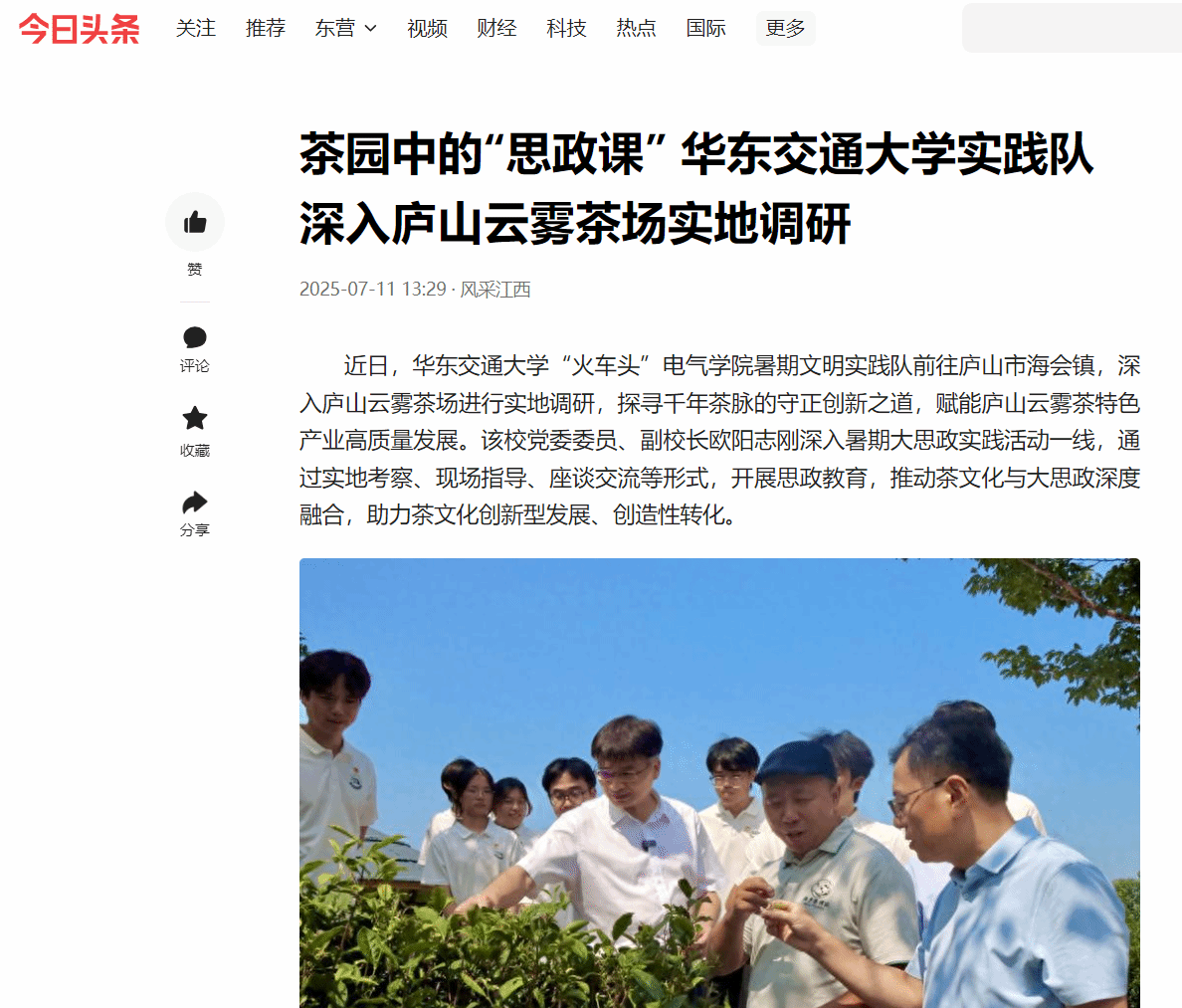 近日,KY开元集团官网入口“火车头”电气学院暑期文明实践队前往庐山市海会镇,深入庐山云雾茶场进行实地调研,探寻千年茶脉的守正创新之道,赋能庐山云雾茶特色产业高质量发展。该校党委委员、副校长欧阳志刚深入暑期大思政实践活动一线,通过实地考察、现场指导、座谈交流等形式,开展思政教育,推动茶文化与大思政深度融合,助力茶文化创新型发展、创造性转化。